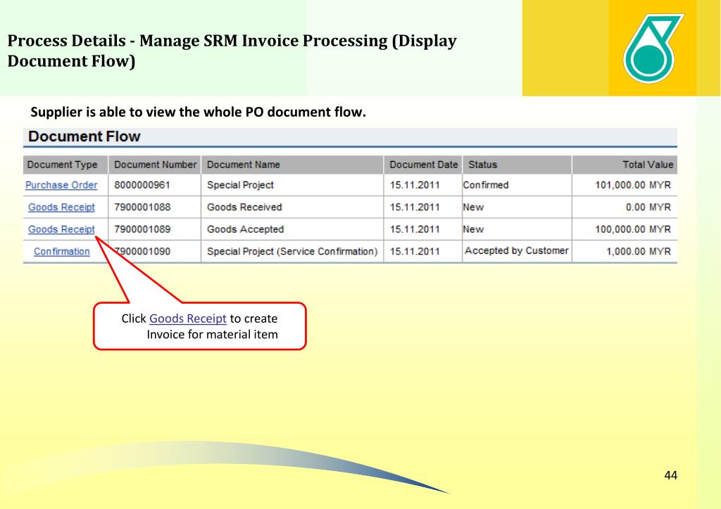 Process Details - Manage SRM Invoice Processing (Display Document Flow) Supplier is able to view the whole PO document flow. Click Goods Receipt to create Invoice for material item
