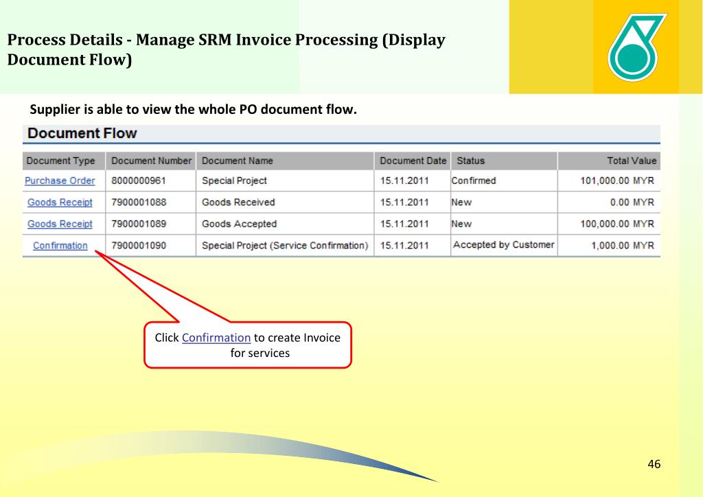 Process Details - Manage SRM Invoice Processing (Display Document Flow) Supplier is able to view the whole PO document flow. Click Confirmation to create Invoice for services