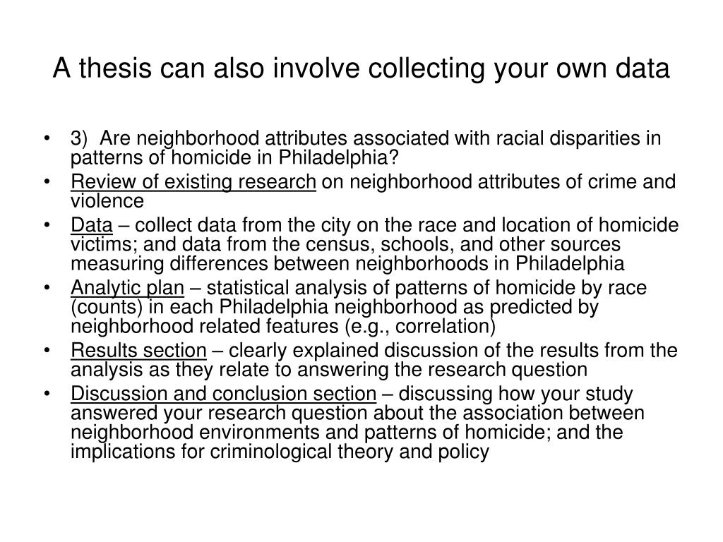 A thesis can also involve collecting your own data • 3) Are neighborhood attributes associated with racial disparities in patterns of homicide in Philadelphia? • Review of existing research on neighborhood attributes of crime and violence • Data – collect data from the city on the race and location of homicide victims; and data from the census, schools, and other sources measuring differences between neighborhoods in Philadelphia • Analytic plan – statistical analysis of patterns of homicide by race (counts) in each Philadelphia neighborhood as predicted by neighborhood related features (e.g., correlation) • Results section – clearly explained discussion of the results from the analysis as they relate to answering the research question • Discussion and conclusion section – discussing how your study answered your research question about the association between neighborhood environments and patterns of homicide; and the implications for criminological theory and policy