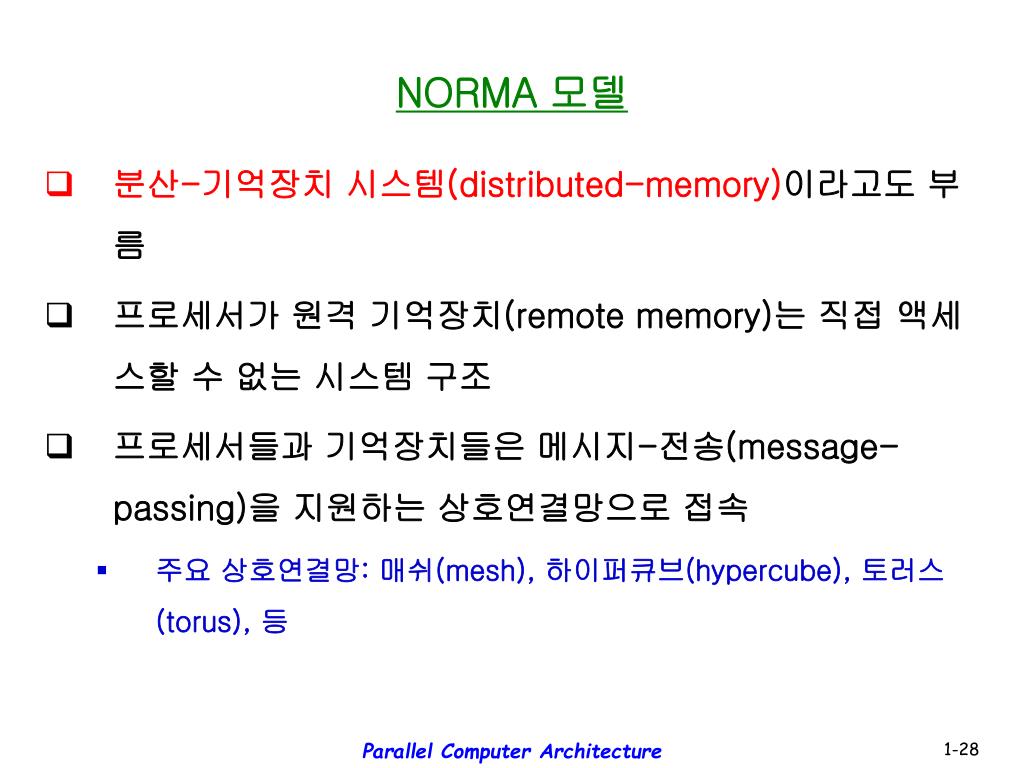 NORMA 모델 • 분산-기억장치 시스템(distributed-memory)이라고도 부름 • 프로세서가 원격 기억장치(remote memory)는 직접 액세스할 수 없는 시스템 구조 • 프로세서들과 기억장치들은 메시지-전송(message-passing)을 지원하는 상호연결망으로 접속 • 주요 상호연결망: 매쉬(mesh), 하이퍼큐브(hypercube), 토러스(torus), 등 Parallel Computer Architecture