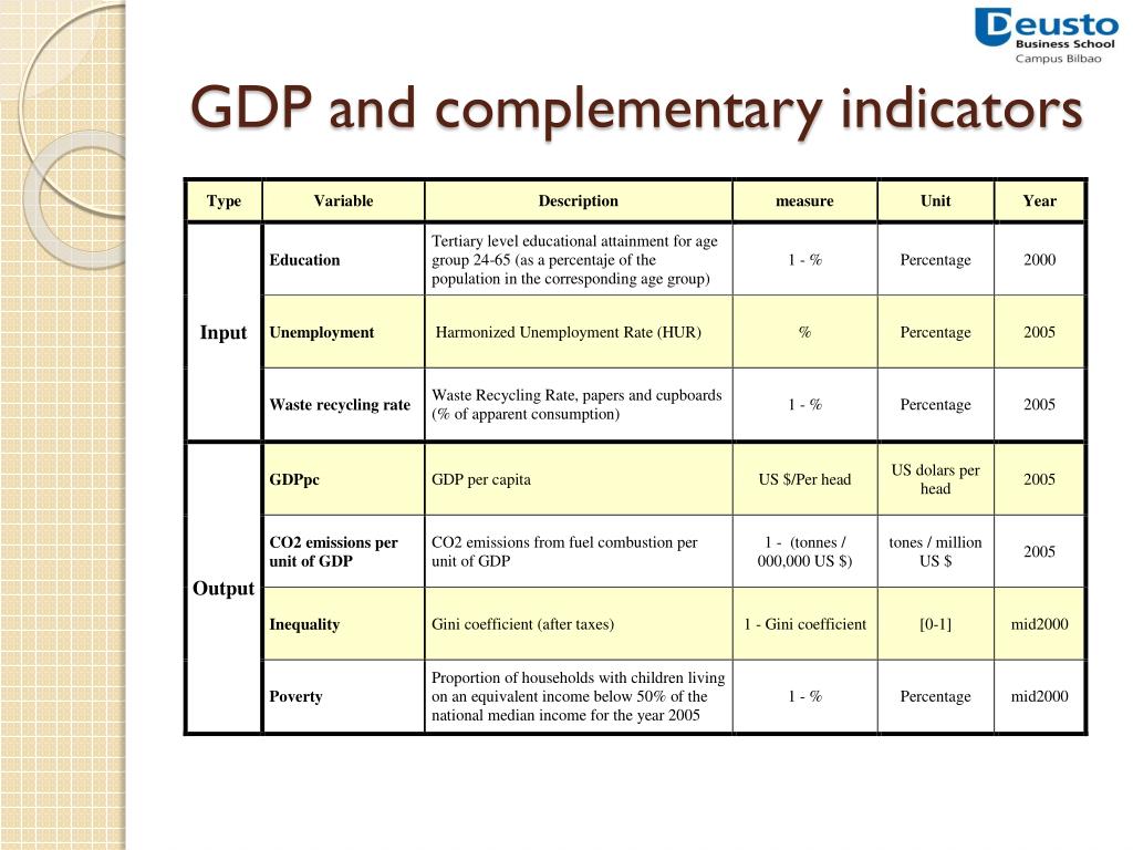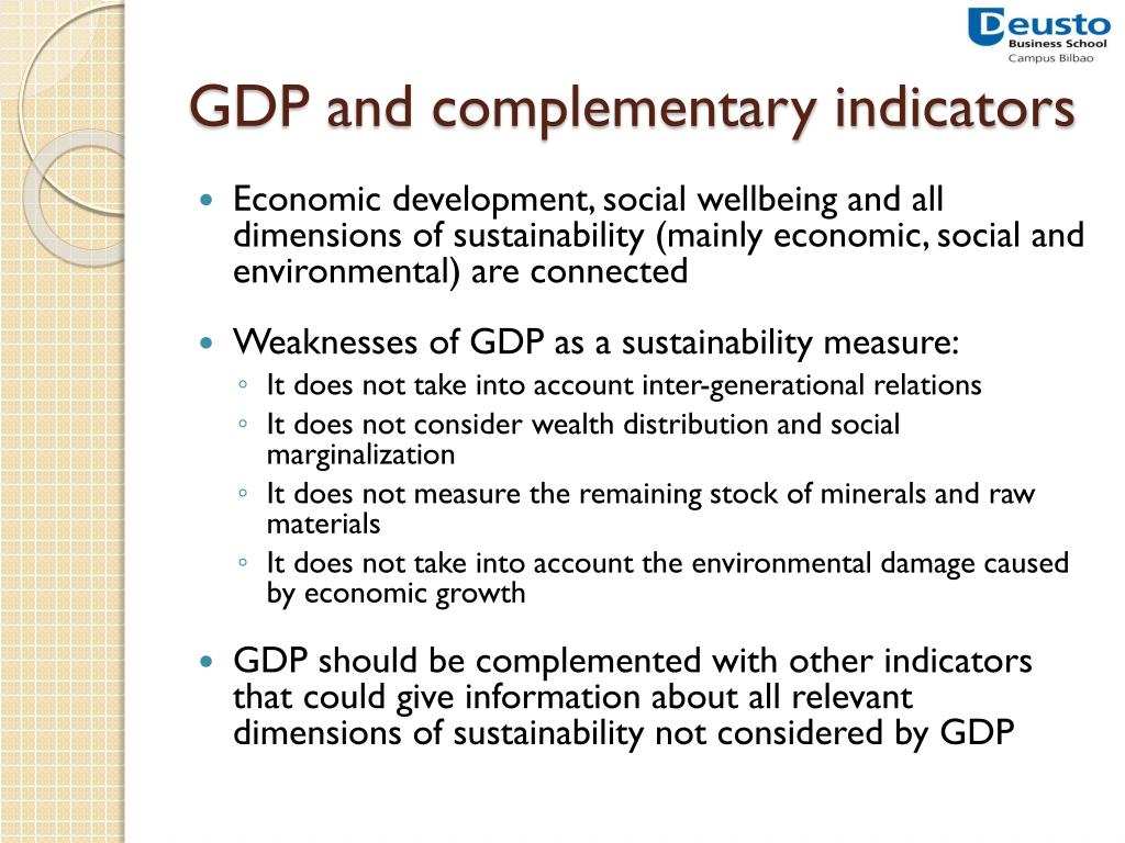 GDP and complementary indicators • Economic development, social wellbeing and all dimensions of sustainability (mainly economic, social and environmental) are connected • Weaknesses of GDP as a sustainability measure: • It does not take into account inter-generational relations • It does not consider wealth distribution and social marginalization • It does not measure the remaining stock of minerals and raw materials • It does not take into account the environmental damage caused by economic growth • GDP should be complemented with other indicators that could give information about all relevant dimensions of sustainability not considered by GDP