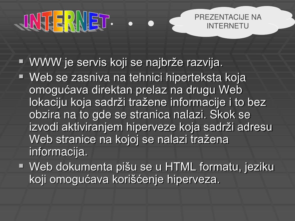 PREZENTACIJE NA INTERNETU INTERNET • WWW je servis koji se najbrže razvija. • Web se zasniva na tehnici hiperteksta koja omogućava direktan prelaz na drugu Web lokaciju koja sadrži tražene informacije i to bez obzira na to gde se stranica nalazi. Skok se izvodi aktiviranjem hiperveze koja sadrži adresu Web stranice na kojoj se nalazi tražena informacija. • Web dokumenta pišu se u HTML formatu, jeziku koji omogućava korišćenje hiperveza.