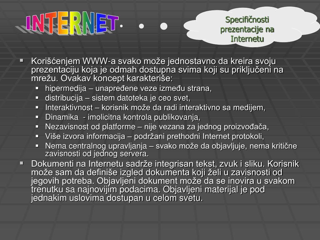 Specifičnosti prezentacije na Internetu INTERNET • Korišćenjem WWW-a svako može jednostavno da kreira svoju prezentaciju koja je odmah dostupna svima koji su priključeni na mrežu. Ovakav koncept karakteriše: • hipermedija – unapređene veze između strana, • distribucija – sistem datoteka je ceo svet, • Interaktivnost – korisnik može da radi interaktivno sa medijem, • Dinamika - imolicitna kontrola publikovanja, • Nezavisnost od platforme – nije vezana za jednog proizvođača, • Više izvora informacija – podržani prethodni Internet protokoli, • Nema centralnog upravljanja – svako može da objavljuje, nema kritične zavisnosti od jednog servera. • Dokumenti na Internetu sadrže integrisan tekst, zvuk i sliku. Korisnik može sam da definiše izgled dokumenta koji želi u zavisnosti od jegovih potreba. Objavljeni dokument može da se inovira u svakom trenutku sa najnovijim podacima. Objavljeni materijal je pod jednakim uslovima dostupan u celom svetu.