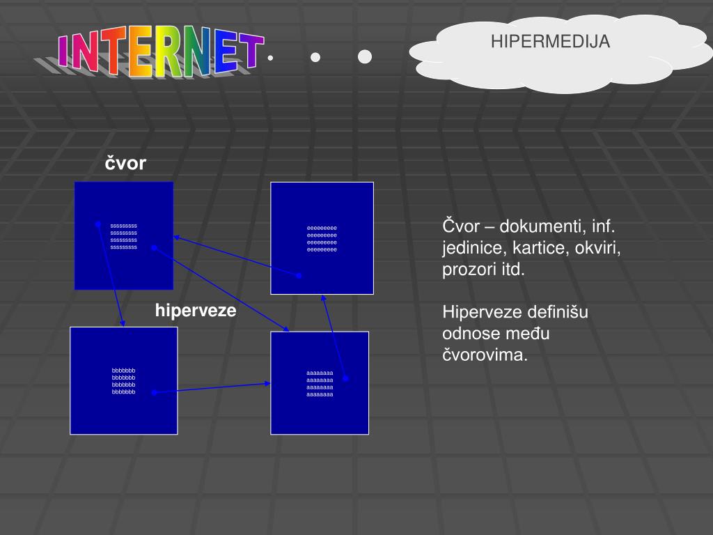 čvor sssssssss sssssssss sssssssss sssssssss eeeeeeeee eeeeeeeee eeeeeeeee eeeeeeeee hiperveze bbbbbbb bbbbbbb bbbbbbb bbbbbbb aaaaaaaa aaaaaaaa aaaaaaaa aaaaaaaa HIPERMEDIJA INTERNET Čvor – dokumenti, inf. jedinice, kartice, okviri, prozori itd. Hiperveze definišu odnose među čvorovima.