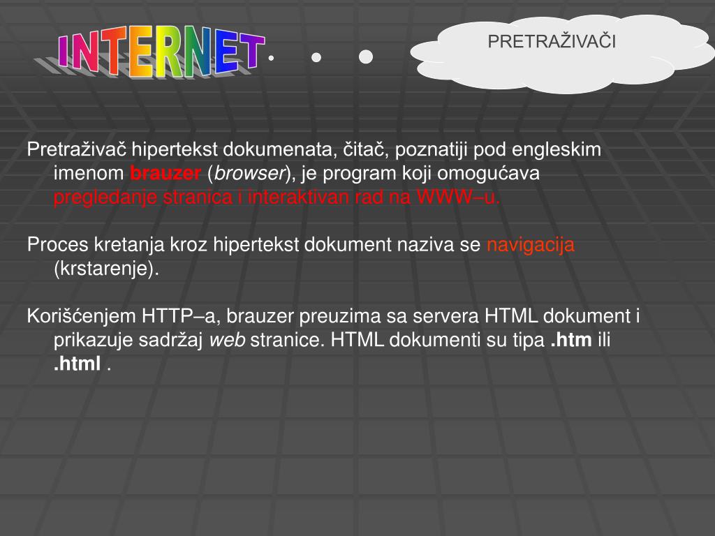 PRETRAŽIVAČI INTERNET Pretraživač hipertekst dokumenata, čitač, poznatiji pod engleskim imenom brauzer(browser), je program koji omogućava pregledanje stranica i interaktivan rad na WWW–u. Proces kretanja kroz hipertekst dokument naziva se navigacija (krstarenje). Korišćenjem HTTP–a, brauzer preuzima sa servera HTML dokument i prikazuje sadržaj web stranice. HTML dokumenti su tipa .htm ili .html .