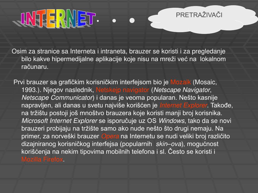 PRETRAŽIVAČI INTERNET Osim za stranice sa Interneta i intraneta, brauzer se koristi i za pregledanje bilo kakve hipermedijalne aplikacije koje nisu na mreži već na lokalnom računaru. Prvi brauzer sa grafičkim korisničkim interfejsom bio je Mozaik(Mosaic, 1993.). Njegov naslednik, Netskejp navigator (Netscape Navigator, Netscape Communicator) i danas je veoma popularan. Nešto kasnije napravljen, ali danas u svetu najviše korišćen je InternetExplorer. Takođe, na tržištu postoji još mnoštvo brauzera koje koristi manji broj korisnika. Microsoft Internet Explorer se isporučuje uz OS Windows, tako da se novi brauzeri probijaju na tržište samo ako nude nešto što drugi nemaju. Na primer, za norveški brauzer Operana Internetu se nudi veliki broj različito dizajniranog korisničkog interfejsa (popularnih skin–ova), mogućnost korišćenja na nekim tipovima mobilnih telefona i sl. Često se koristi i Mozilla Firefox.