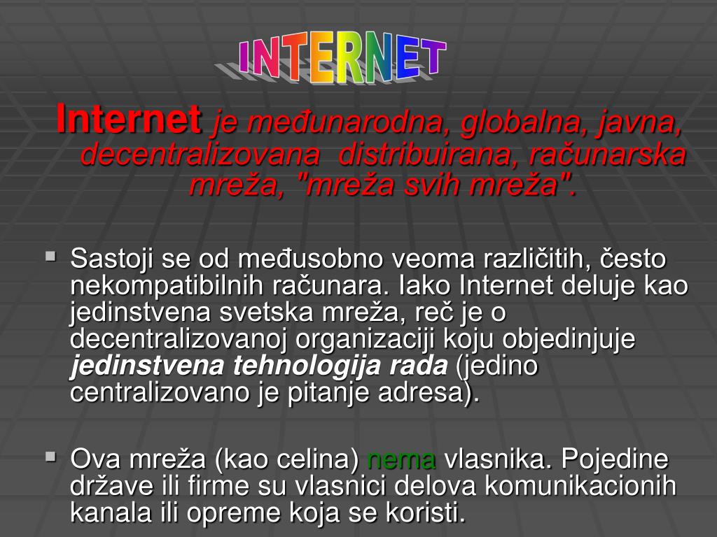 INTERNET Internet je međunarodna, globalna, javna, decentralizovana distribuirana, računarska mreža, "mreža svih mreža". • Sastoji se od međusobno veoma različitih, često nekompatibilnih računara. Iako Internet deluje kao jedinstvena svetska mreža, reč je o decentralizovanoj organizaciji koju objedinjuje jedinstvena tehnologija rada (jedino centralizovano je pitanje adresa). • Ova mreža (kao celina)nema vlasnika. Pojedine države ili firme su vlasnici delova komunikacionih kanala ili opreme koja se koristi.