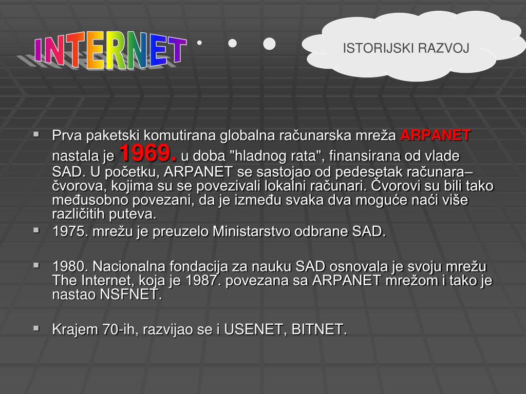 ISTORIJSKI RAZVOJ INTERNET • Prva paketski komutirana globalna računarska mreža ARPANET nastala je 1969. u doba "hladnog rata", finansirana od vlade SAD. U početku, ARPANET se sastojao od pedesetak računara–čvorova, kojima su se povezivali lokalni računari. Čvorovi su bili tako međusobno povezani, da je između svaka dva moguće naći više različitih puteva. • 1975. mrežu je preuzelo Ministarstvo odbrane SAD. • 1980. Nacionalna fondacija za nauku SAD osnovala je svoju mrežu The Internet, koja je 1987. povezana sa ARPANET mrežom i tako je nastao NSFNET. • Krajem 70-ih, razvijao se i USENET, BITNET.
