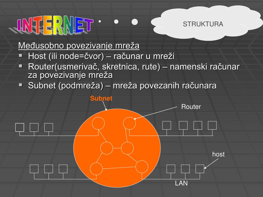 STRUKTURA INTERNET Međusobno povezivanje mreža • Host (ili node=čvor) – računar u mreži • Router(usmerivač, skretnica, rute) – namenski računar za povezivanje mreža • Subnet (podmreža) – mreža povezanih računara Subnet Router host LAN