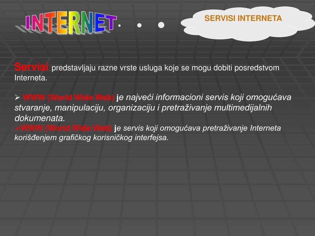 SERVISI INTERNETA INTERNET • Servisipredstavljaju razne vrste usluga koje se mogu dobiti posredstvom Interneta. • WWW (World Wide Web)je najveći informacioni servis koji omogućava stvaranje, manipulaciju, organizaciju i pretraživanje multimedijalnih dokumenata. • WWW (World Wide Web)je servis koji omogućava pretraživanje Interneta korišđenjem grafičkog korisničkog interfejsa.