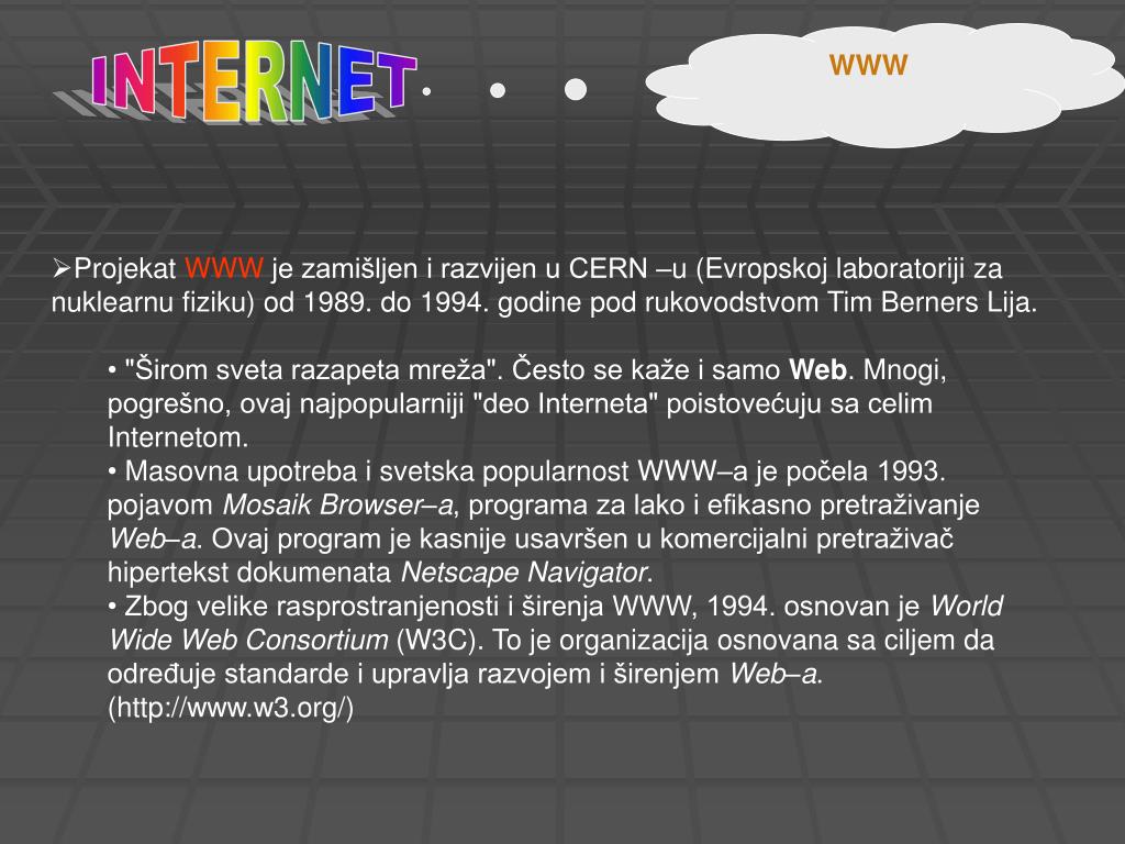 WWW INTERNET • Projekat WWW je zamišljen i razvijen u CERN –u (Evropskoj laboratoriji za nuklearnu fiziku) od 1989. do 1994. godine pod rukovodstvom Tim Berners Lija. • "Širom sveta razapeta mreža". Često se kaže i samo Web. Mnogi, pogrešno, ovaj najpopularniji "deo Interneta" poistovećuju sa celim Internetom. • Masovna upotreba i svetska popularnost WWW–a je počela 1993. pojavom Mosaik Browser–a, programa za lako i efikasno pretraživanje Web–a. Ovaj program je kasnije usavršen u komercijalni pretraživač hipertekst dokumenata Netscape Navigator. • Zbog velike rasprostranjenosti i širenja WWW, 1994. osnovan je World Wide Web Consortium (W3C). To je organizacija osnovana sa ciljem da određuje standarde i upravlja razvojem i širenjem Web–a. (http://www.w3.org/)