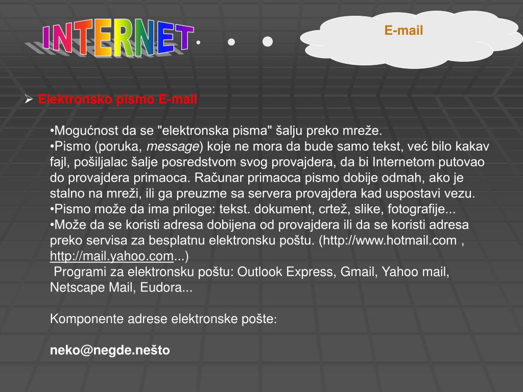E-mail INTERNET • Elektronsko pismo E-mail • Mogućnost da se "elektronska pisma" šalju preko mreže. • Pismo (poruka, message) koje ne mora da bude samo tekst, već bilo kakav fajl, pošiljalac šalje posredstvom svog provajdera, da bi Internetom putovao do provajdera primaoca. Računar primaoca pismo dobije odmah, ako je stalno na mreži, ili ga preuzme sa servera provajdera kad uspostavi vezu. • Pismo može da ima priloge: tekst. dokument, crtež, slike, fotografije... • Može da se koristi adresa dobijena od provajdera ili da se koristi adresa preko servisa za besplatnu elektronsku poštu. (http://www.hotmail.com , http://mail.yahoo.com...) • Programi za elektronsku poštu:Outlook Express, Gmail, Yahoo mail, Netscape Mail, Eudora... • Komponente adrese elektronske pošte • neko@negde.nešto