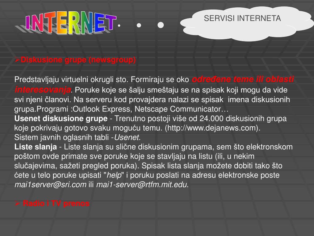 SERVISI INTERNETA INTERNET • Diskusione grupe (newsgroup) • Predstavljaju virtuelni okrugli sto. Formiraju se oko određene teme ili oblasti interesovanja. Poruke koje se šalju smeštaju se na spisak koji mogu da vide svi njeni članovi. Na serveru kod provajdera nalazi se spisak imena diskusionih grupa.Programi :OutlookExpress, NetscapeCommunicator… • Usenet diskusione grupe - Trenutno postoji više od 24.000 diskusionih grupa koje pokrivaju gotovo svaku moguću temu. (http://www.dejanews.com). • Sistem javnih oglasnih tabli -Usenet. • Liste slanja - Liste slanja su slične diskusionim grupama, sem što elektronskom poštom ovde primate sve poruke koje se stavljaju na listu (ili, u nekim slučajevima, sažeti pregled poruka). Spisak lista slanja možete dobiti tako što ćete u telo poruke upisati "help" i poruku poslati na adresu elektronske poste mai1server@sri.com ili mai1-server@rtfm.mit.edu. • Radio i TV prenos