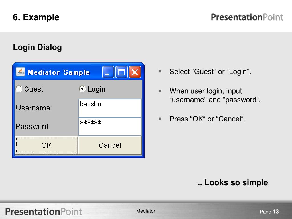 6. Example Login Dialog • Select “Guest“ or “Login“. • When user login, input “username“ and “password“. • Press “OK“ or “Cancel“. .. Looks so simple Page 13