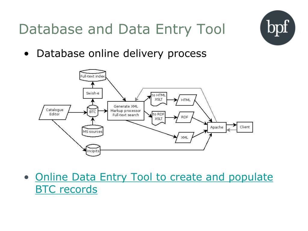 Database and Data Entry Tool • Database online delivery process • Online Data Entry Tool to create and populate BTC records