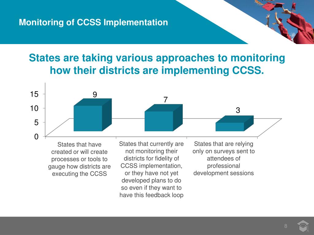 Monitoring of CCSS Implementation States that currently are not monitoring their districts for fidelity of CCSS implementation, or they have not yet developed plans to do so even if they want to have this feedback loop States that are relying only on surveys sent to attendees of professional development sessions States that have created or will create processes or tools to gauge how districts are executing the CCSS • States are taking various approaches to monitoring how their districts are implementing CCSS.