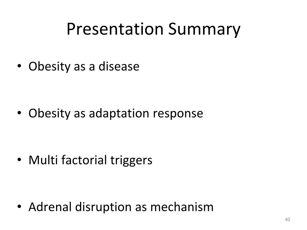 Presentation Summary • Obesity as a disease • Obesity as adaptation response • Multi factorial triggers • Adrenal disruption as mechanism