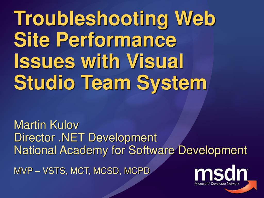 Troubleshooting Web Site Performance Issues with Visual Studio Team System Martin Kulov Director .NET Development National Academy for Software Development MVP – VSTS, MCT, MCSD, MCPD
