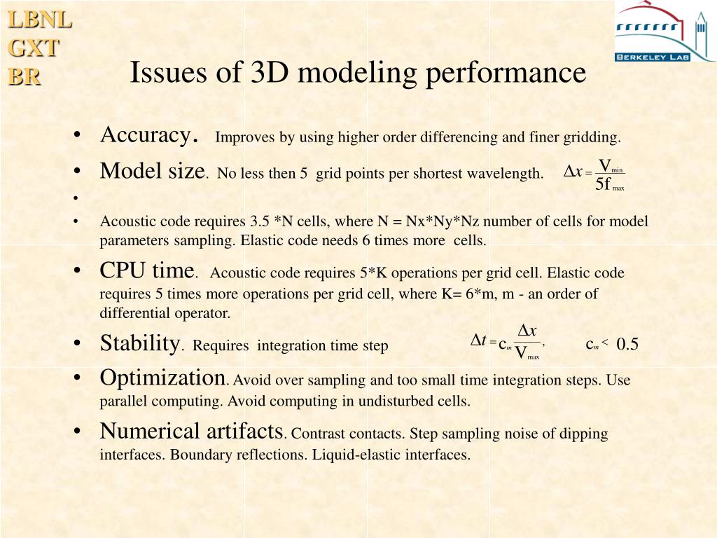 Issues of 3D modeling performance • Accuracy. Improves by using higher order differencing and finer gridding. • Model size. No less then 5 grid points per shortest wavelength. • Acoustic code requires 3.5 *N cells, where N = Nx*Ny*Nz number of cells for model parameters sampling. Elastic code needs 6 times more cells. • CPU time. Acoustic code requires 5*K operations per grid cell. Elastic code requires 5 times more operations per grid cell, where K= 6*m, m - an order of differential operator. • Stability. Requires integration time step • Optimization. Avoid over sampling and too small time integration steps. Use parallel computing. Avoid computing in undisturbed cells. • Numerical artifacts. Contrast contacts. Step sampling noise of dipping interfaces. Boundary reflections. Liquid-elastic interfaces. 0.5