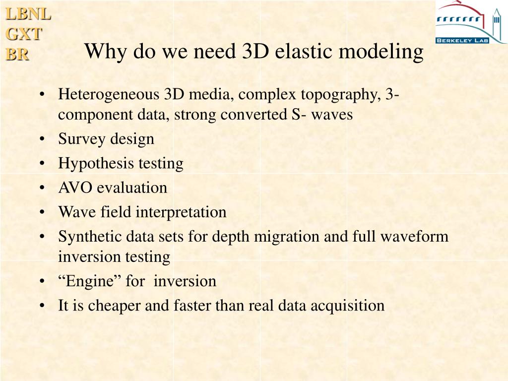 Why do we need 3D elastic modeling • Heterogeneous 3D media, complex topography, 3-component data, strong converted S- waves • Survey design • Hypothesis testing • AVO evaluation • Wave field interpretation • Synthetic data sets for depth migration and full waveform inversion testing • “Engine” for inversion • It is cheaper and faster than real data acquisition