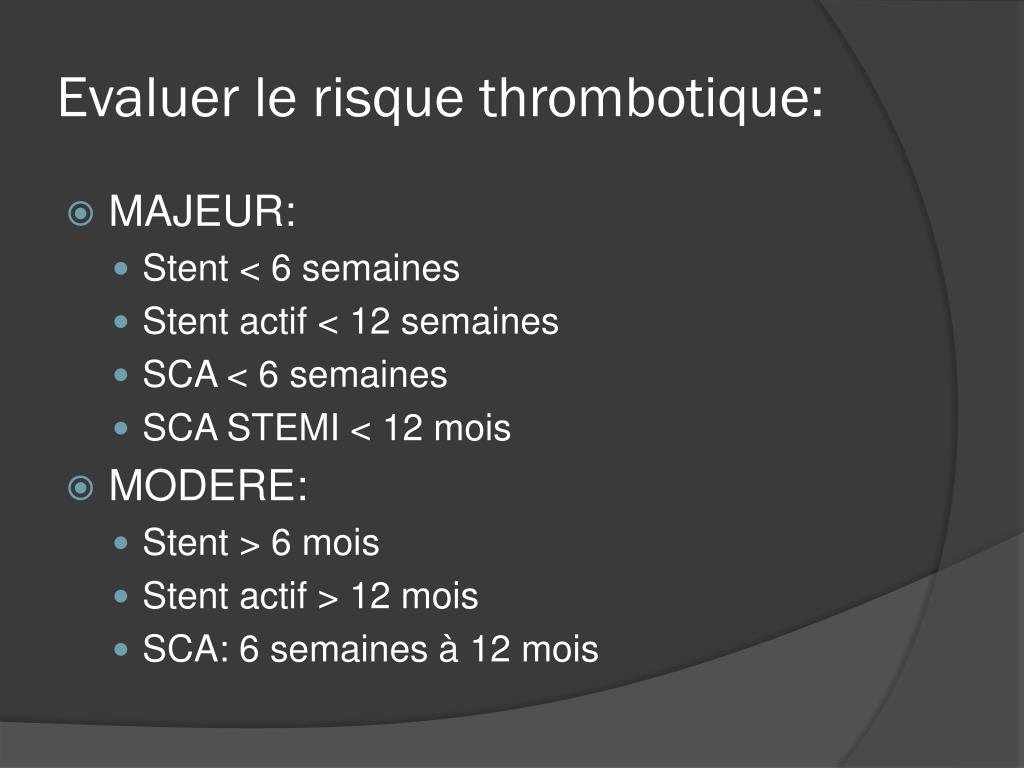 Evaluer le risque thrombotique: • MAJEUR: • Stent < 6 semaines • Stent actif < 12 semaines • SCA < 6 semaines • SCA STEMI < 12 mois • MODERE: • Stent > 6 mois • Stent actif > 12 mois • SCA: 6 semaines à 12 mois