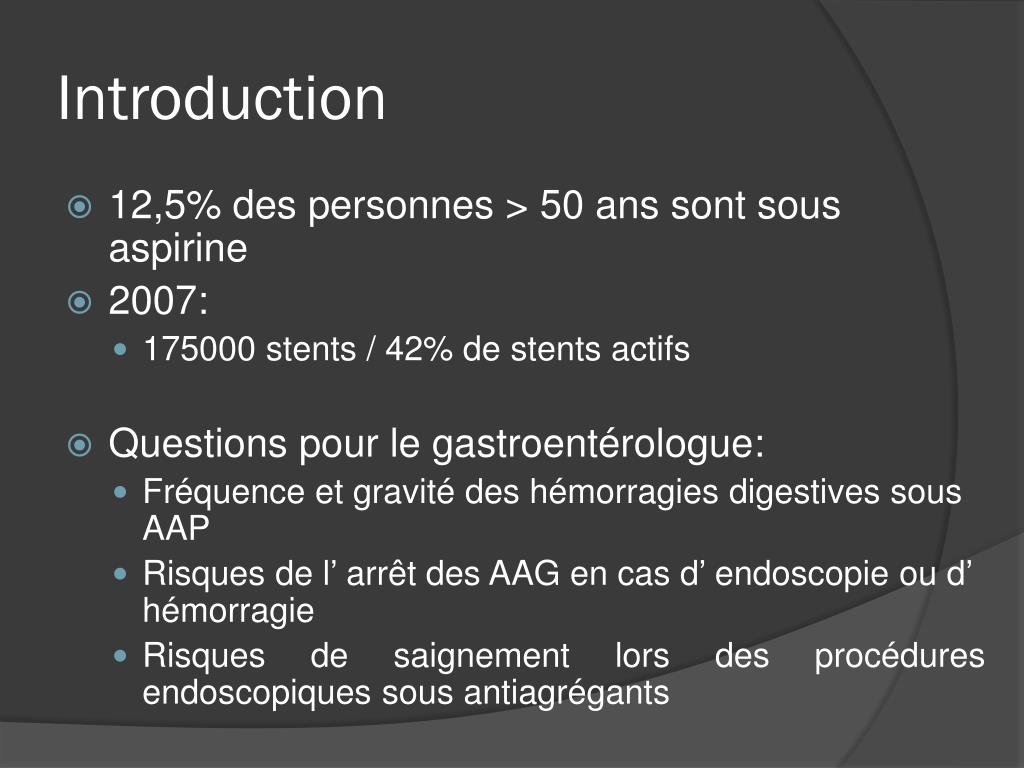 Introduction • 12,5% des personnes > 50 ans sont sous aspirine • 2007: • 175000 stents / 42% de stents actifs • Questions pour le gastroentérologue: • Fréquence et gravité des hémorragies digestives sous AAP • Risques de l’ arrêt des AAG en cas d’ endoscopie ou d’ hémorragie • Risques de saignement lors des procédures endoscopiques sous antiagrégants