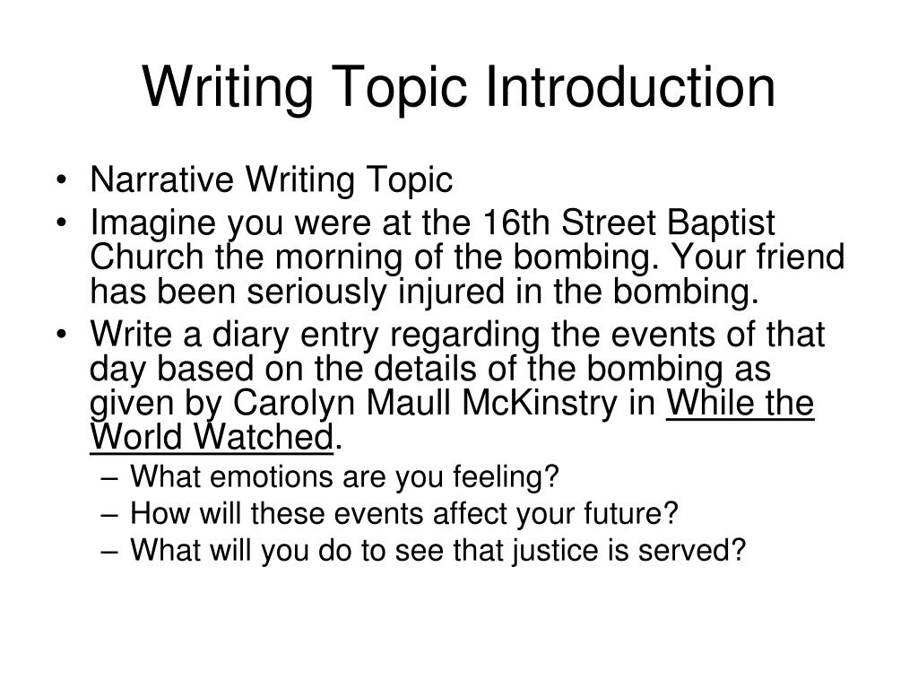 Writing Topic Introduction • Narrative Writing Topic • Imagine you were at the 16th Street Baptist Church the morning of the bombing. Your friend has been seriously injured in the bombing. • Write a diary entry regarding the events of that day based on the details of the bombing as given by Carolyn Maull McKinstry in While the World Watched. • What emotions are you feeling? • How will these events affect your future? • What will you do to see that justice is served?