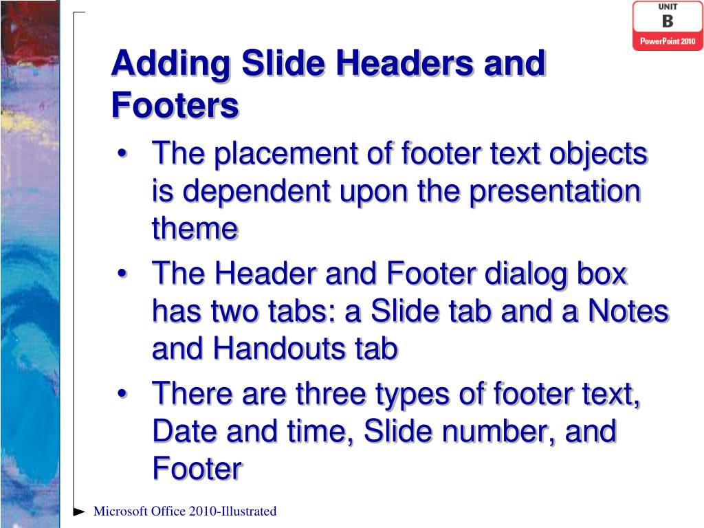 Adding Slide Headers and Footers • The placement of footer text objects is dependent upon the presentation theme • The Header and Footer dialog box has two tabs: a Slide tab and a Notes and Handouts tab • There are three types of footer text, Date and time, Slide number, and Footer Microsoft Office 2010-Illustrated
