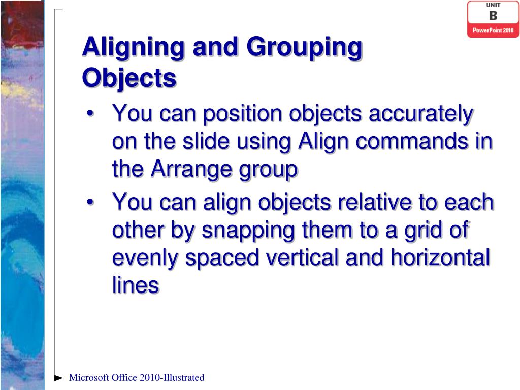 Aligning and Grouping Objects • You can position objects accurately on the slide using Align commands in the Arrange group • You can align objects relative to each other by snapping them to a grid of evenly spaced vertical and horizontal lines Microsoft Office 2010-Illustrated