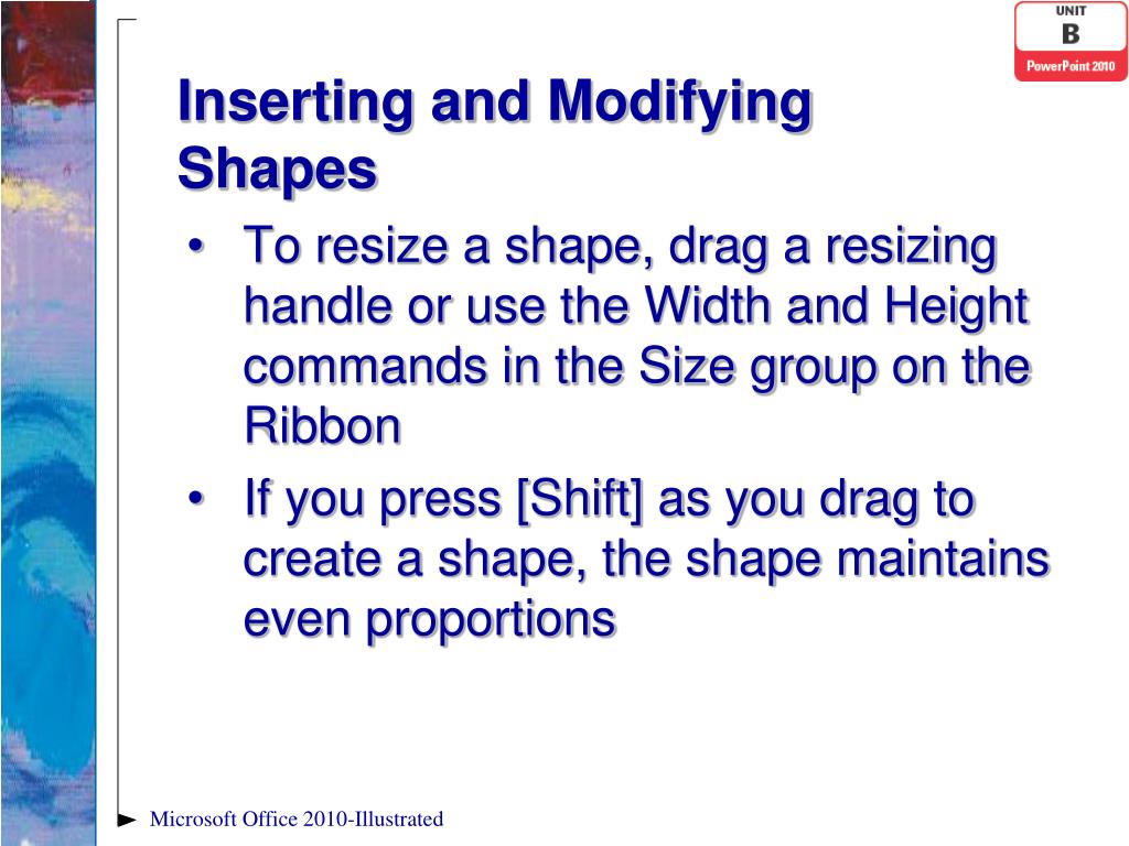 Inserting and Modifying Shapes • To resize a shape, drag a resizing handle or use the Width and Height commands in the Size group on the Ribbon • If you press [Shift] as you drag to create a shape, the shape maintains even proportions Microsoft Office 2010-Illustrated
