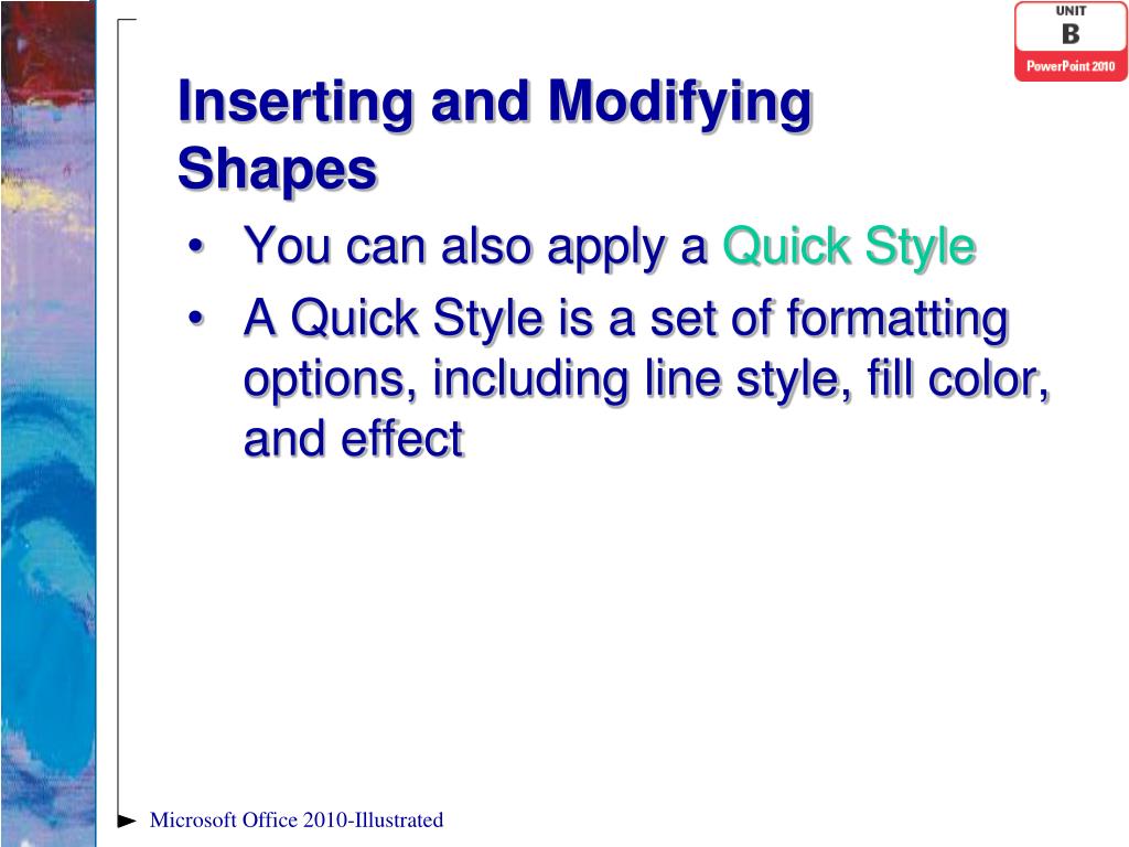 Inserting and Modifying Shapes • You can also apply a Quick Style • A Quick Styleis a set of formatting options, including line style, fill color, and effect Microsoft Office 2010-Illustrated
