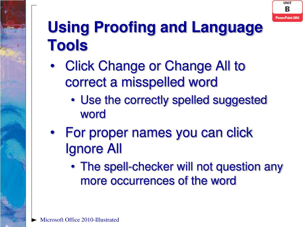 Using Proofing and Language Tools Page 41 Figure B-15 • You can use the spell-checking feature in PowerPoint to check for and correct spelling errors Microsoft Office 2010-Illustrated