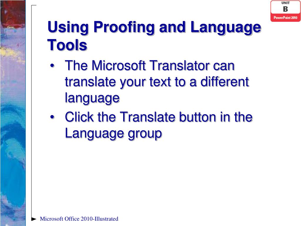 Using Proofing and Language Tools • The Microsoft Translator can translate your text to a different language • Click the Translate button in the Language group Microsoft Office 2010-Illustrated