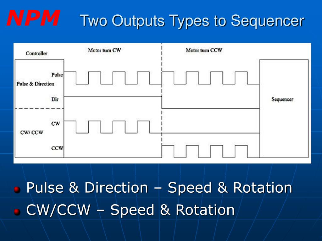 Two Outputs Types to Sequencer • Pulse & Direction – Speed & Rotation • CW/CCW – Speed & Rotation