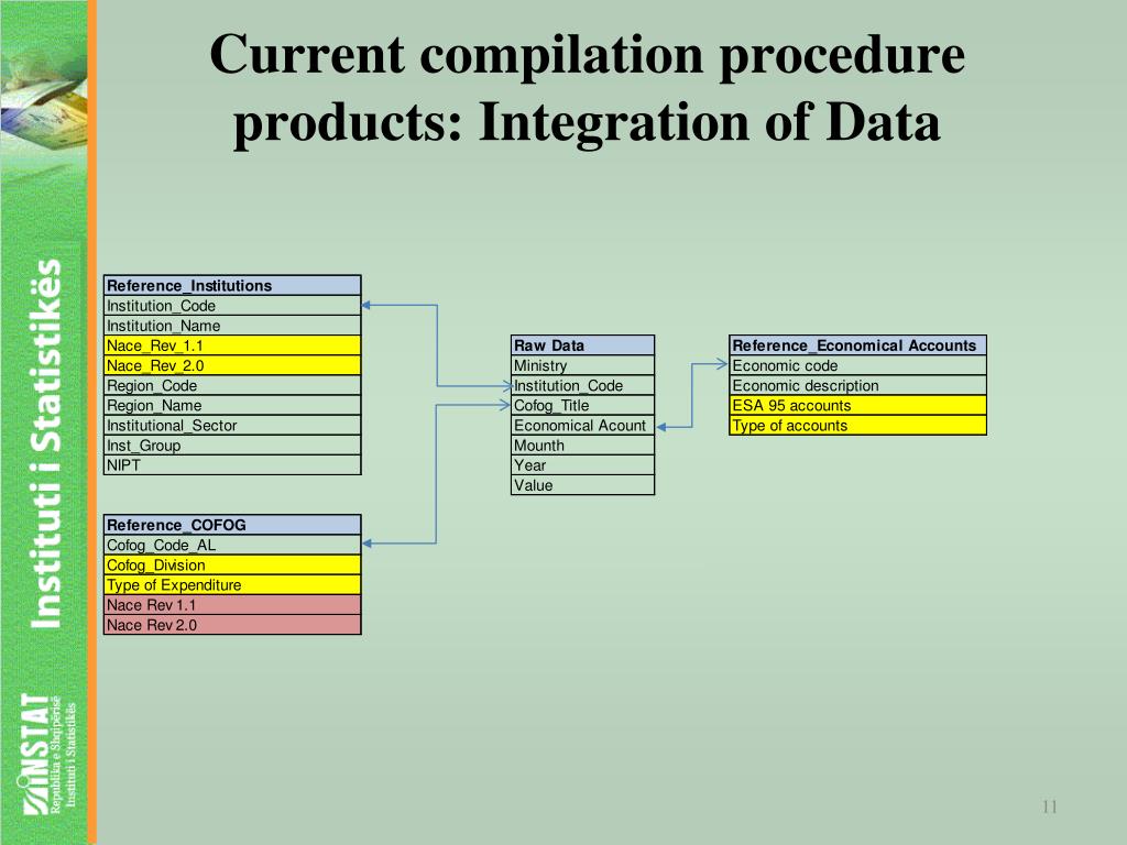 Current compilation procedureproducts: Data Verification • INSTAT is aware of the need to make certain verifications / edits of data, once compilation is completed, to identify inconsistencies • Between statistical tables (stocks /flows, e.g., net change in the stock of cash consistent with currency and deposits) • With GFS methodology (e.g., interest expense should be the same or less then the one reported in public debt transactions ) • With historical trends (size of components of revenue and expense as percentages of totals; consistency between change in interest expense as percentage of stocks of public debt by instrument) • Need to revise data if anomalies are found and provide reasons for apparent inconsistencies if data are correct • Need sound inter-institutional arrangements to resolve inconsistencies in data before disseminating both data sets