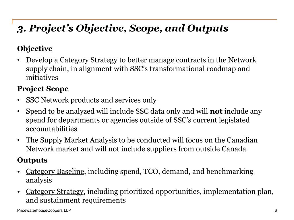 3. Project’s Objective, Scope, and Outputs Objective • Develop a Category Strategy to better manage contracts in the Network supply chain, in alignment with SSC’s transformational roadmap and initiatives Project Scope • SSC Network products and services only • Spend to be analyzed will include SSC data only and will not include any spend for departments or agencies outside of SSC’s current legislated accountabilities • The Supply Market Analysis to be conducted will focus on the Canadian Network market and will not include suppliers from outside Canada Outputs • Category Baseline, including spend, TCO, demand, and benchmarking analysis • Category Strategy, including prioritized opportunities, implementation plan, and sustainment requirements