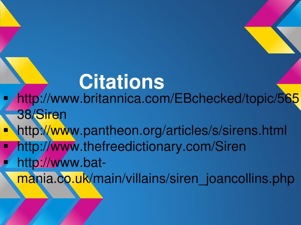 Citations http://www.britannica.com/EBchecked/topic/56538/Siren http://www.pantheon.org/articles/s/sirens.html http://www.thefreedictionary.com/Siren http://www.bat-mania.co.uk/main/villains/siren_joancollins.php