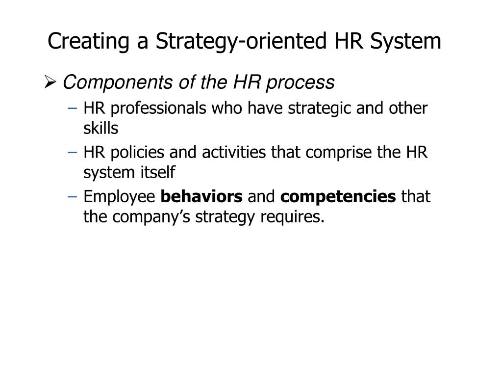 Creating a Strategy-oriented HR System • Components of the HR process • HR professionals who have strategic and other skills • HR policies and activities that comprise the HR system itself • Employee behaviors and competencies that the company’s strategy requires.