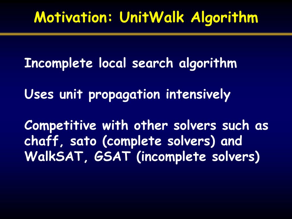 Motivation: UnitWalk Algorithm Incomplete local search algorithm Uses unit propagation intensively Competitive with other solvers such as chaff, sato (complete solvers) and WalkSAT, GSAT (incomplete solvers)