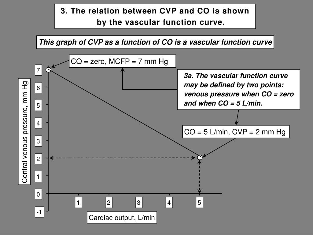 CO = zero, MCFP = 7 mm Hg This graph of CVP as a function of CO is a vascular function curve 3. The relation between CVP and CO is shown by the vascular function curve. 7 3a. The vascular function curve may be defined by two points: venous pressure when CO = zero and when CO = 5 L/min. 6 5 4 CO = 5 L/min, CVP = 2 mm Hg Central venous pressure, mm Hg 3 2 1 0 1 2 3 4 5 -1 Cardiac output, L/min