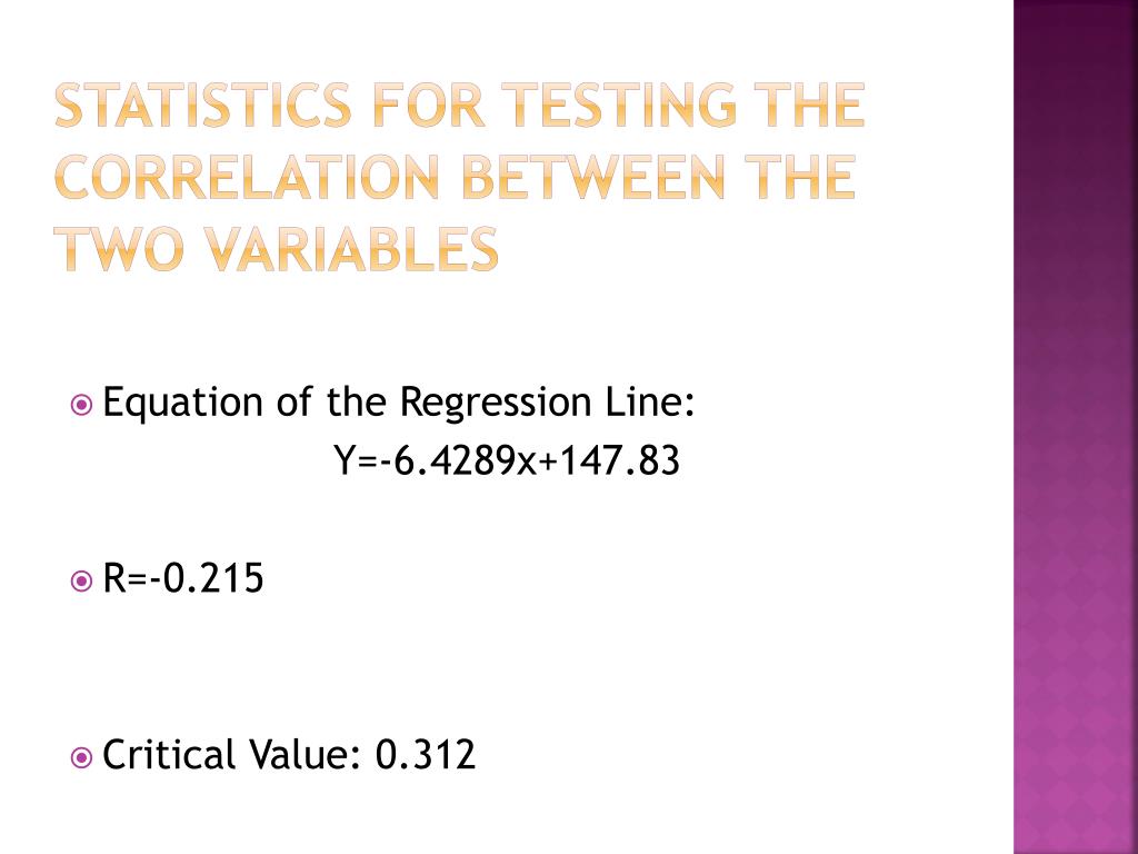 Statistics for testing the correlation between the two variables • Equation of the Regression Line: Y=-6.4289x+147.83 • R=-0.215 • Critical Value: 0.312