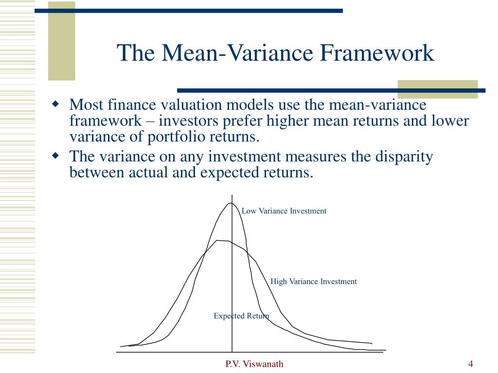 The Mean-Variance Framework • Most finance valuation models use the mean-variance framework – investors prefer higher mean returns and lower variance of portfolio returns. • The variance on any investment measures the disparity between actual and expected returns. Low Variance Investment High Variance Investment Expected Return P.V. Viswanath