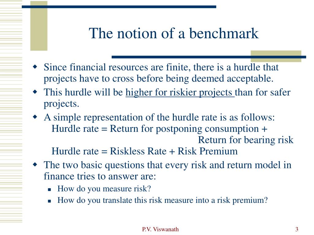 The notion of a benchmark • Since financial resources are finite, there is a hurdle that projects have to cross before being deemed acceptable. • This hurdle will be higher for riskier projects than for safer projects. • A simple representation of the hurdle rate is as follows: Hurdle rate = Return for postponing consumption + Return for bearing risk Hurdle rate = Riskless Rate + Risk Premium • The two basic questions that every risk and return model in finance tries to answer are: • How do you measure risk? • How do you translate this risk measure into a risk premium? P.V. Viswanath