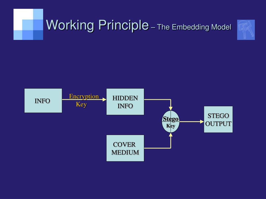 Working Principle – The Embedding Model INFO HIDDEN INFO Encryption Key STEGO OUTPUT Stego Key COVER MEDIUM