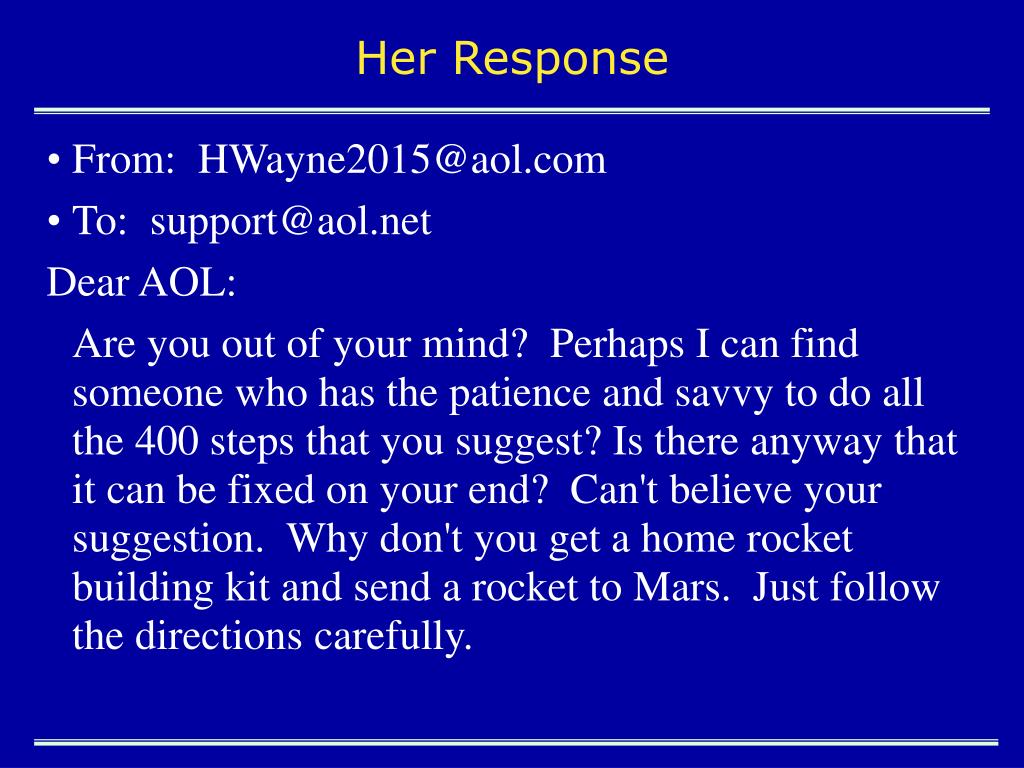 Her Response • From: HWayne2015@aol.com • To: support@aol.net Dear AOL: Are you out of your mind? Perhaps I can find someone who has the patience and savvy to do all the 400 steps that you suggest? Is there anyway that it can be fixed on your end? Can't believe your suggestion. Why don't you get a home rocket building kit and send a rocket to Mars. Just follow the directions carefully.