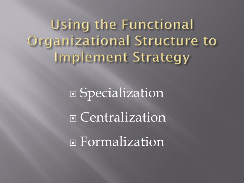 Using the Functional Organizational Structureto Implement Strategy • Specialization • Centralization • Formalization
