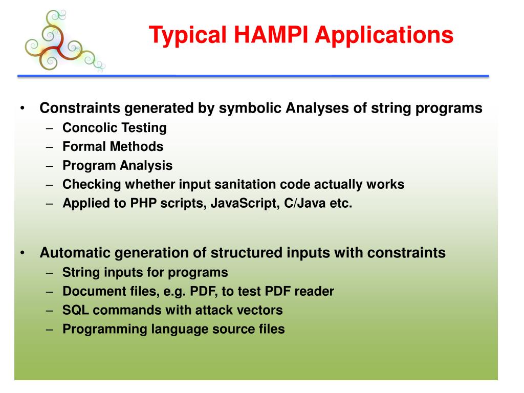 HAMPIA Novel String Solver • Analyses of string programs • Formal Methods • Testing • Program Analysis • Efficient • Expressive • Robust and easy to use • Tested on many diverse apps • Applied to important and hard problems Program String constraints Analysis HAMPI constraint solutions solution