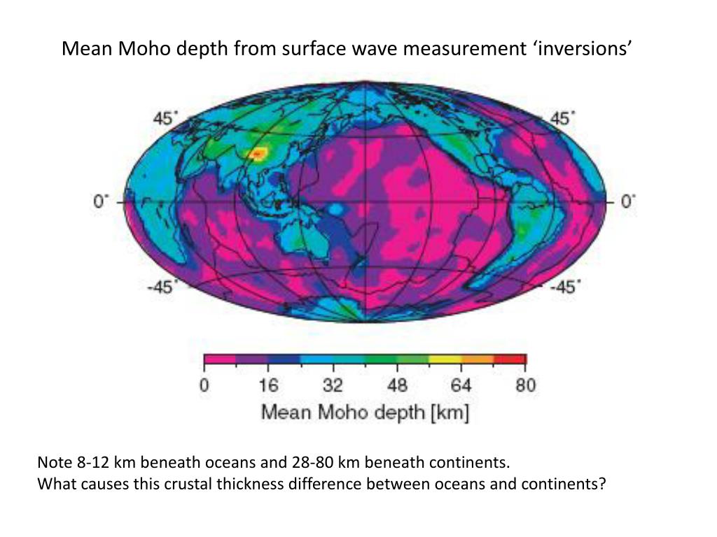 Mean Moho depth from surface wave measurement ‘inversions’ Note 8-12 km beneath oceans and 28-80 km beneath continents. What causes this crustal thickness difference between oceans and continents?