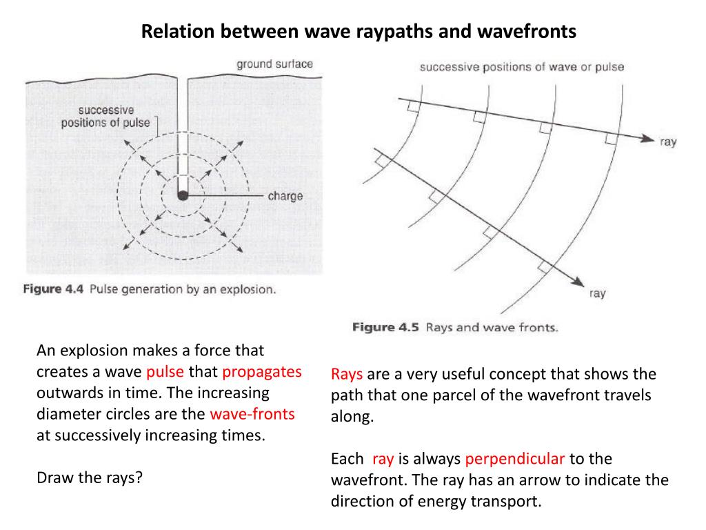 Relation between wave raypaths and wavefronts An explosion makes a force that creates a wave pulse that propagates outwards in time. The increasing diameter circles are the wave-fronts at successively increasing times. Draw the rays? Rays are a very useful concept that shows the path that one parcel of the wavefront travels along. Each ray is always perpendicular to the wavefront. The ray has an arrow to indicate the direction of energy transport.