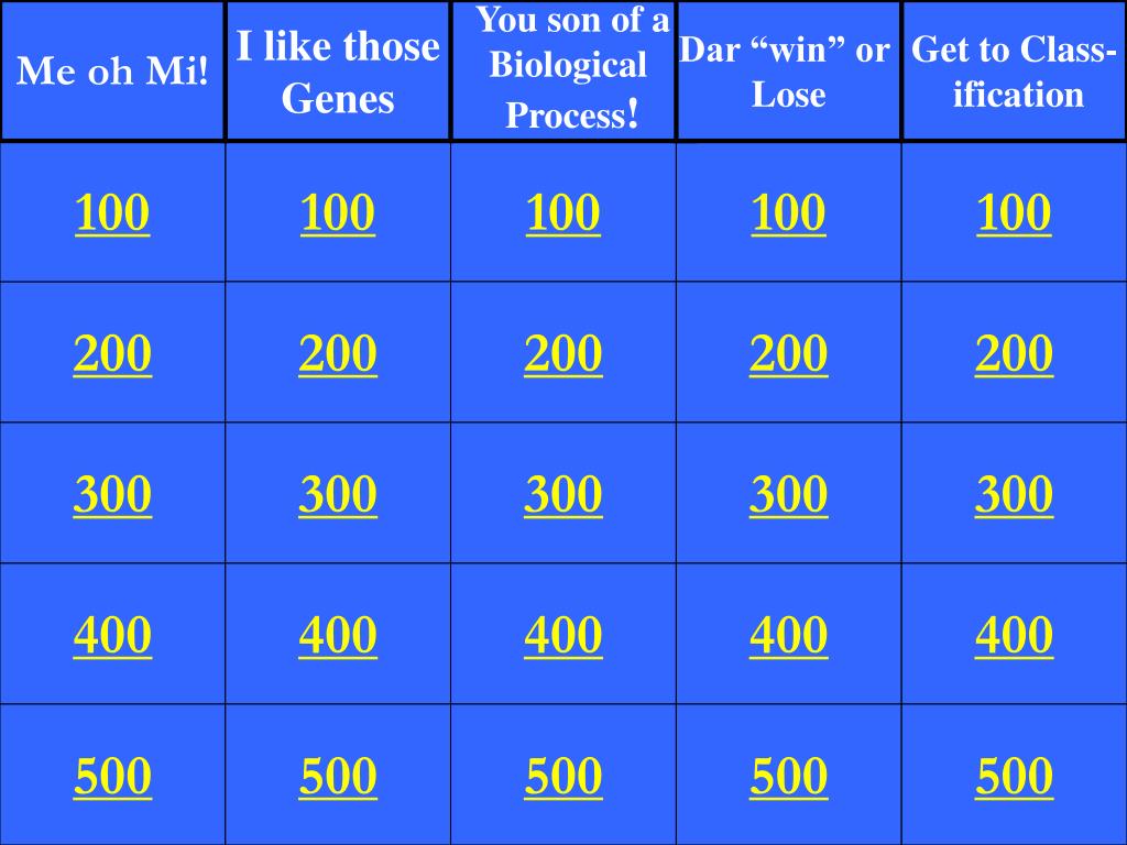 Me oh Mi! I like those Genes You son of a Biological Process! Dar “win” or Lose Get to Class- ification 100 100 100 100 100 200 200 200 200 200 300 300 300 300 300 400 400 400 400 400 500 500 500 500 500
